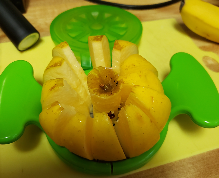 When I consume apples, I make it easy on myself. I take the corer/slicer and split my apple in one clean CHUNK. It comes out looking like this: